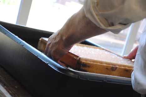 With the screen on top, the mould can now be dipped into a vat with suspended fibers.